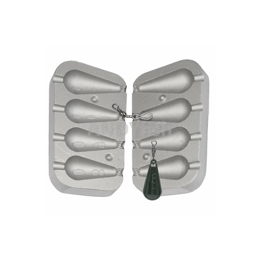 Hliníková forma F120 na výrobu 4ks koncovej záťaže - slza. Hmotnosť odliatkov 70; 90; 100; 120g.